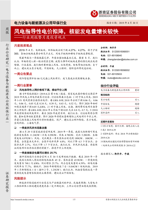 【浙商证券】【20190430】电力设备与新能源及公用环保行业行业周报暨月度投资观点:风电指导性电价拟降,核能发电量增长较快-5页