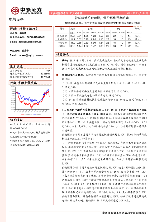 【中泰证券】【20190503】关于完善光伏发电上网电价机制有关问题的通知:补贴政策符合预期,量价环比拐点明确-5页