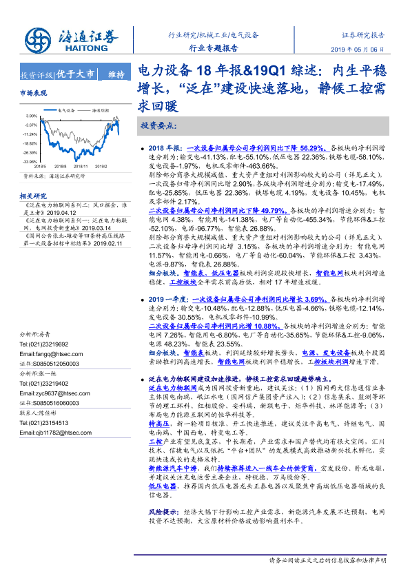 【海通证券】【20190506】电力设备18年报&19Q1综述:内生平稳增长,“泛在”建设快速落地,静候工控需求回暖-18页