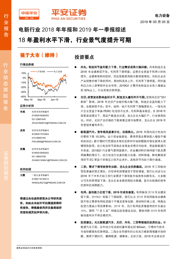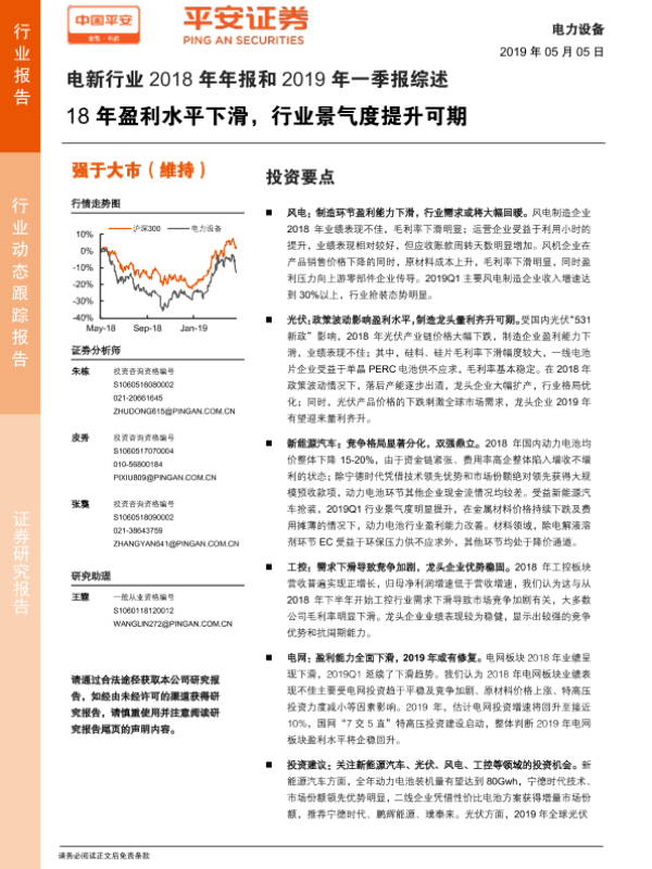【平安证券】【20190505】电新行业2018年年报和2019年一季报综述:18年盈利水平下滑,行业景气度提升可期-25页