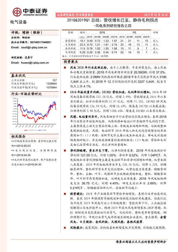 毛利拐点 营收增长 行业深度 风电行业 风电设备