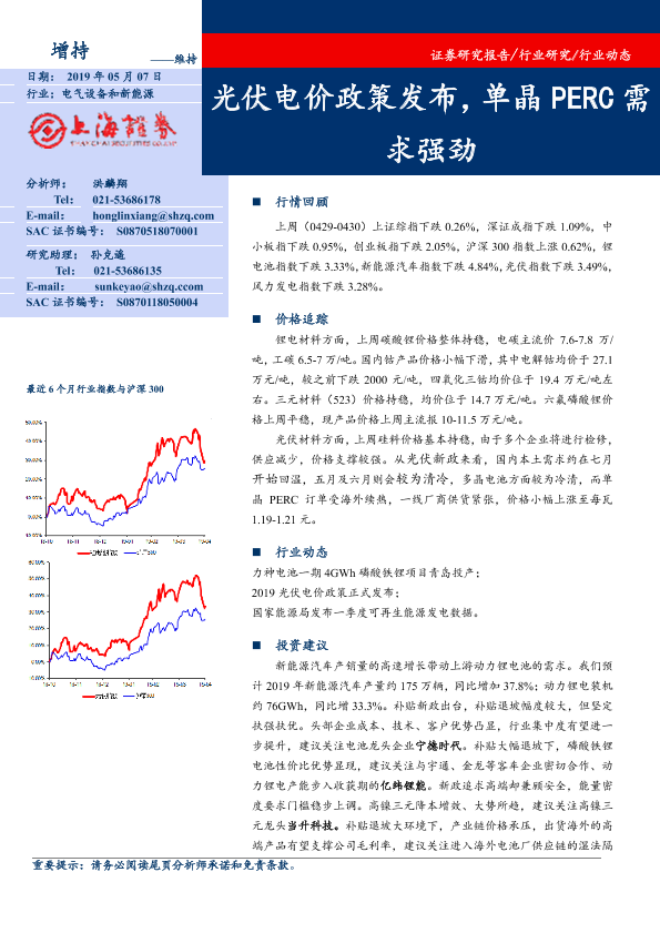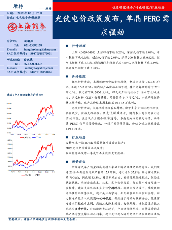 【上海证券】【20190507】20190507-上海证券-电气设备和新能源行业动态:光伏电价政策发布,单晶PERC需求强劲-15页