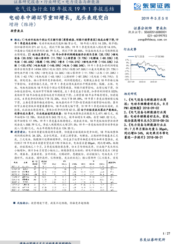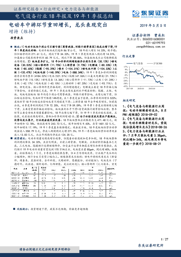 【东吴证券】【20190505】电气设备行业18年报及19年1季报总结:电动车中游环节重回增长,龙头表现突出-27页