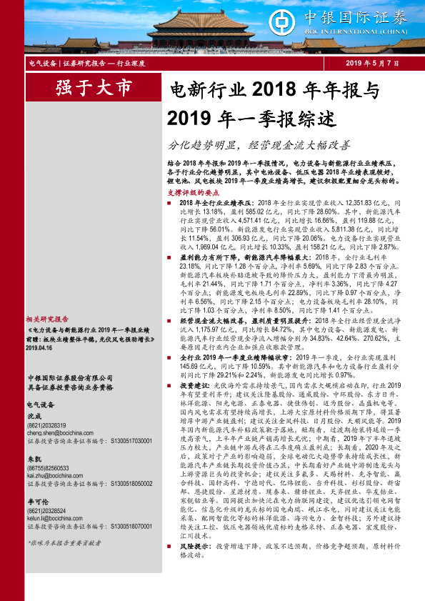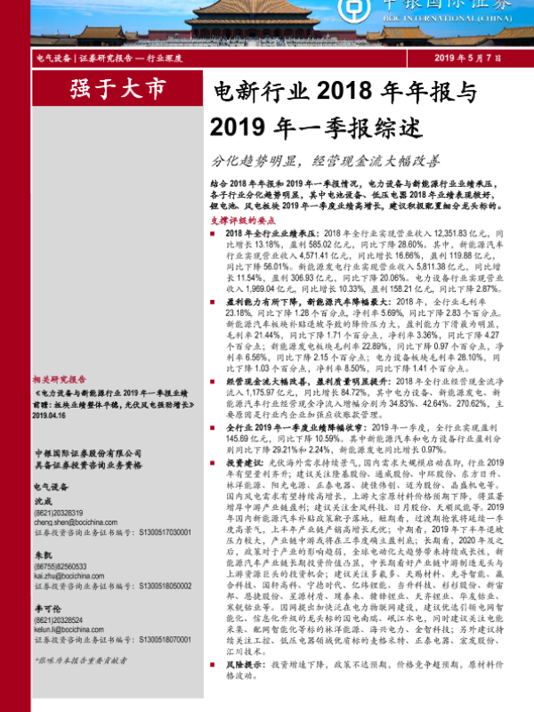 【中银证券】【20190507】电新行业2018年年报与2019年一季报综述:分化趋势明显,经营现金流大幅改善-20页