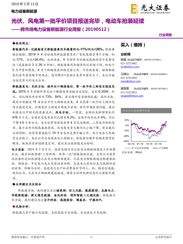 【光大证券】【20190513】跨市场电力设备新能源行业周报:光伏、风电第一批平价项目报送完毕,电动车抢装延续-14页