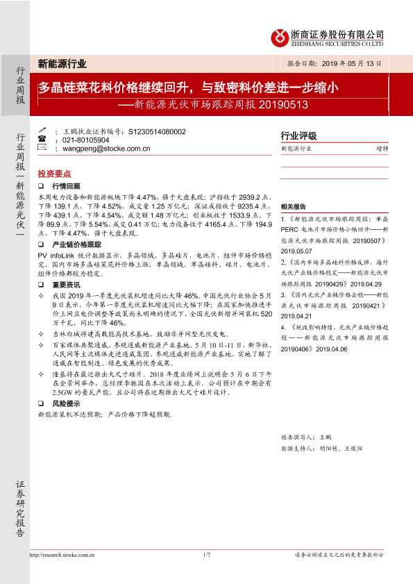 【浙商证券】【20190513】20190513-浙商证券-新能源光伏行业跟踪周报:多晶硅菜花料价格继续回升,与致密料价差进一步缩小-7页