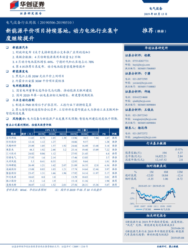 【华创证券】【20190513】电气设备行业周报:新能源平价项目持续落地,动力电池行业集中度继续提升-24页