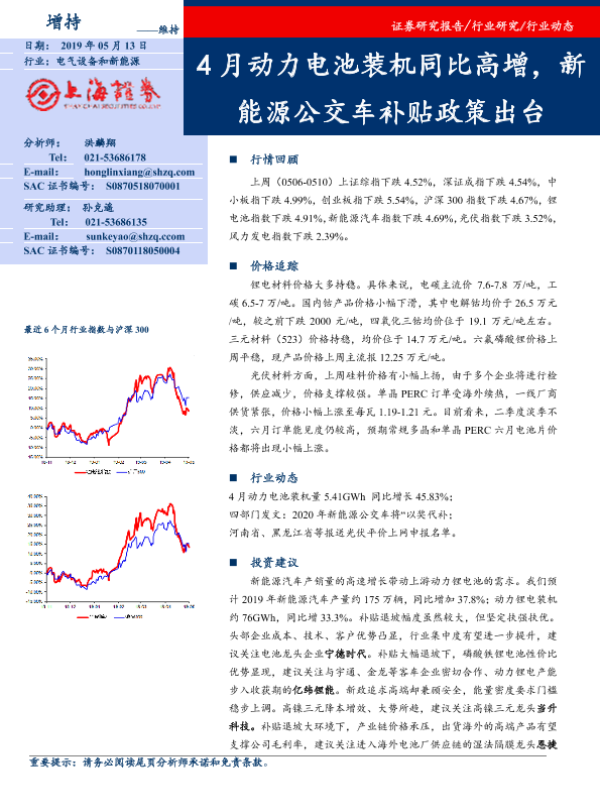 【上海证券】【20190513】20190513-上海证券-电气设备和新能源行业动态:4月动力电池装机同比高增,新能源公交车补贴政策出台-14页