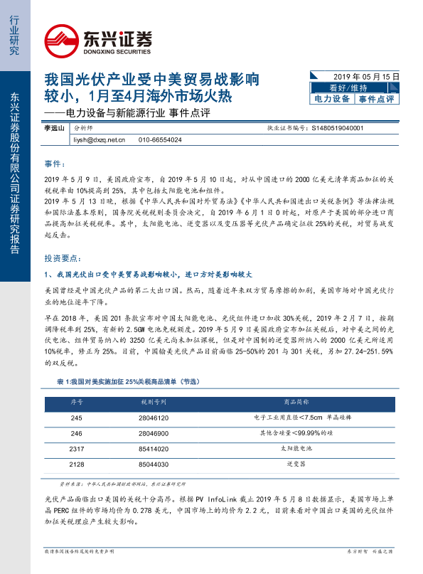 【东兴证券】【20190515】我国光伏产业受中美贸易战影响较小,1月至4月海外市场火热-7页
