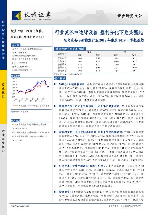 【长城证券】【20190515】电力设备与新能源行业2018年报及2019一季报总结:行业复苏中边际改善,盈利分化下龙头崛起-20页