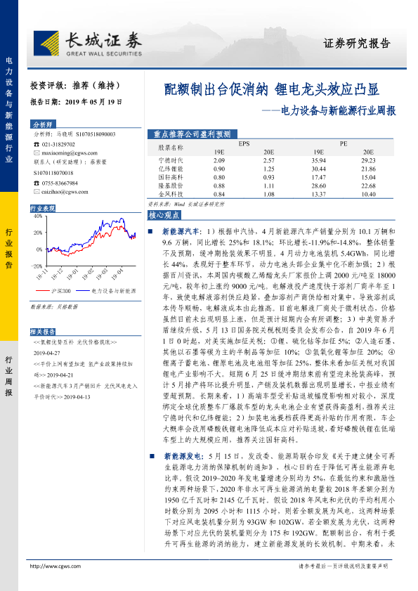 【长城证券】【20190519】20190519-长城证券-电力设备与新能源行业周报:配额制出台促消纳,锂电龙头效应凸显-16页
