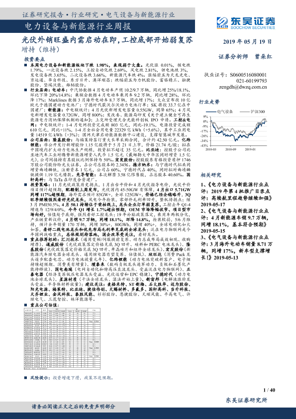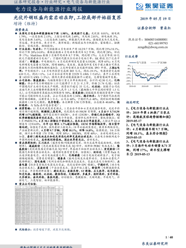 【东吴证券】【20190519】电力设备与新能源行业周报:光伏外销旺盛内需启动在即,工控底部开始弱复苏-40页