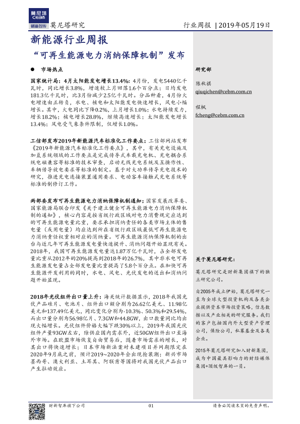 【莫尼塔研究】【20190519】20190519-莫尼塔投资-新能源行业周报:“可再生能源电力消纳保障机制”发布-9页