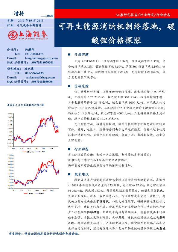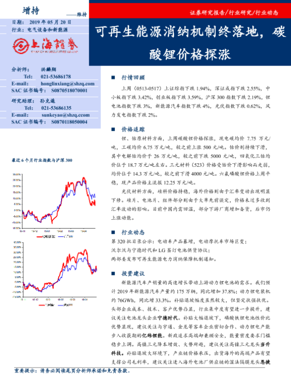 【上海证券】【20190520】电气设备行业动态:可再生能源消纳机制终落地,碳酸锂价格探涨-15页