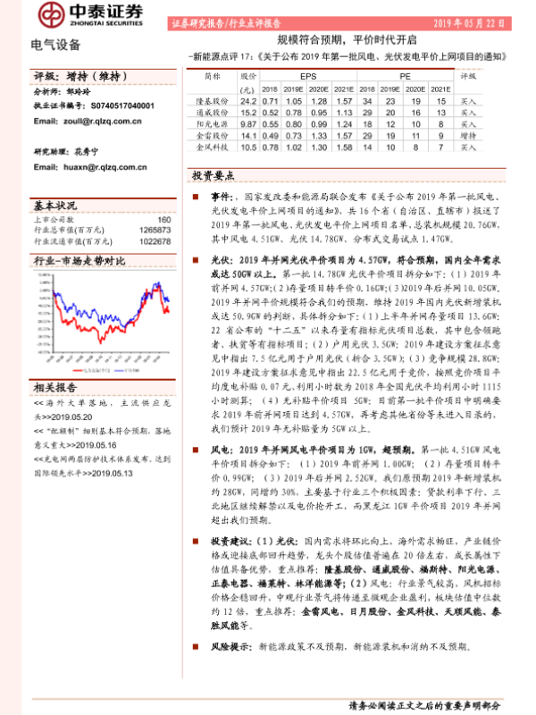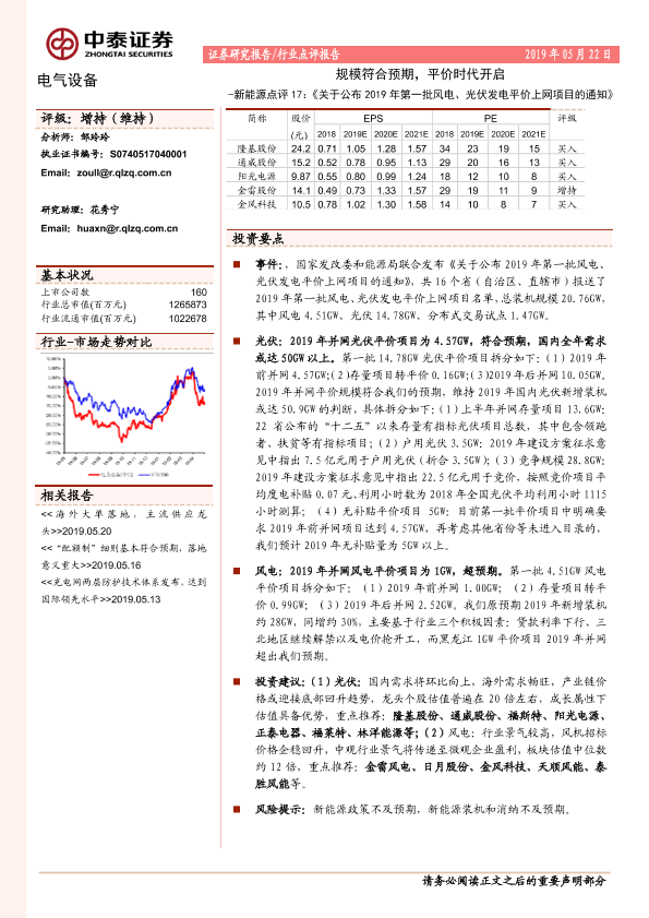 【中泰证券】【20190522】2019年第一批风电、光伏发电平价上网项目的通知点评-3页