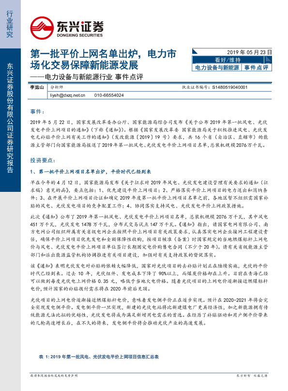 【东兴证券】【20190523】电力设备与新能源行业事件点评:第一批平价上网名单出炉,电力市场化交易保障新能源发展-8页