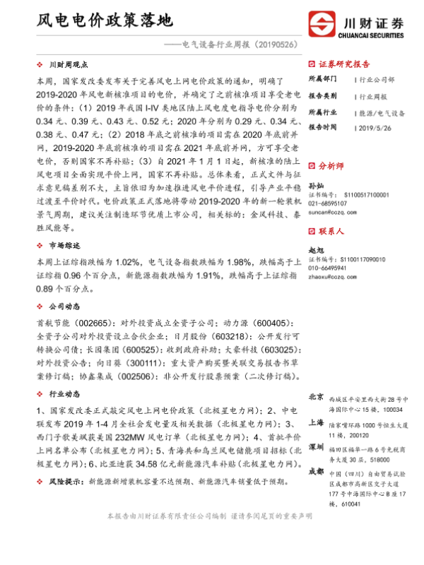 【川财证券】【20190526】20190526-川财证券-电气设备行业周报:风电电价政策落地-10页