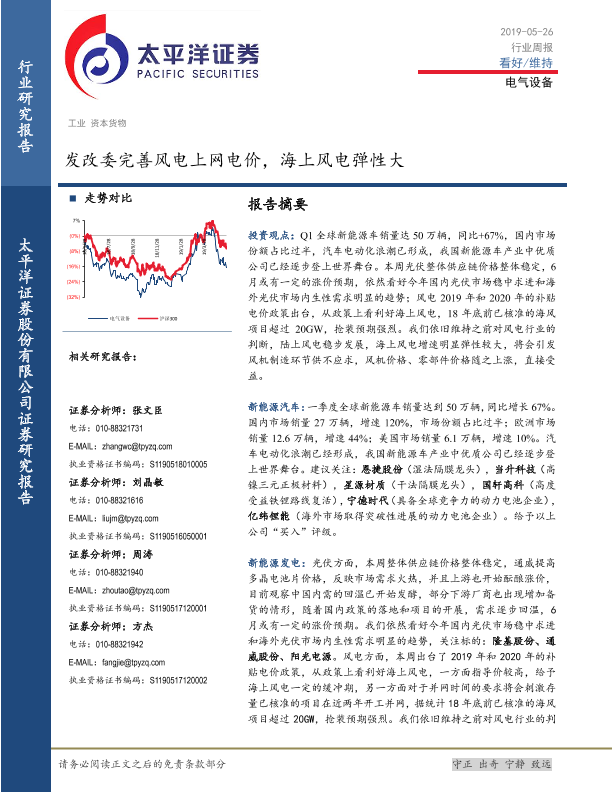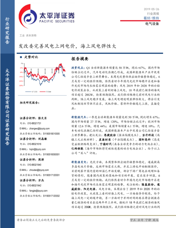 【太平洋证券】【20190526】电气设备行业周报:发改委完善风电上网电价,海上风电弹性大-19页