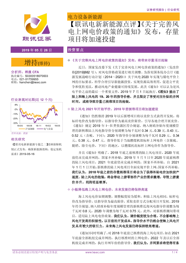 【粤开证券】【20190526】关于完善风电上网电价政策的通知发布,存量项目将加速投建-4页
