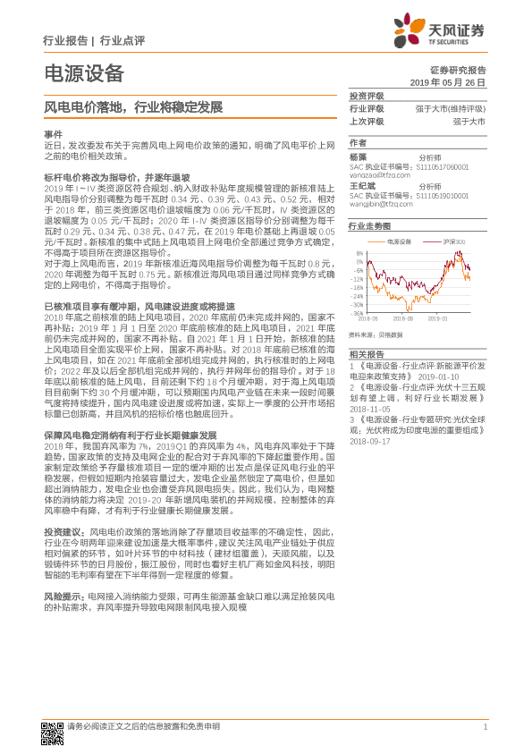 【天风证券】【20190526】电源设备行业点评:风电电价落地,行业将稳定发展-4页