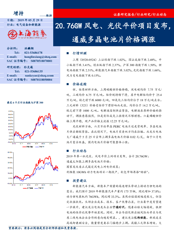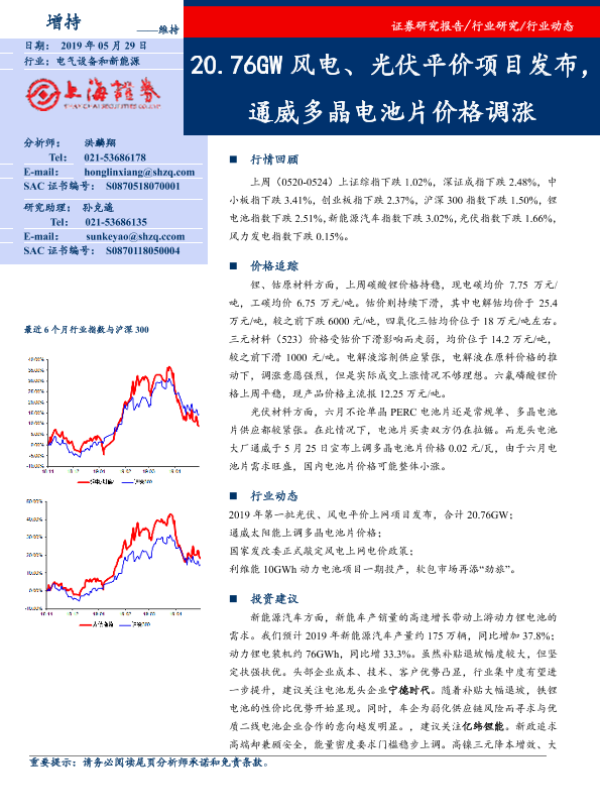 【上海证券】【20190529】电气设备和新能源:20.76GW风电、光伏平价项目发布,通威多晶电池片价格调涨-15页