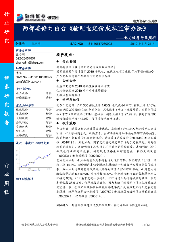 【渤海证券】【20190531】电力设备行业周报:两部委修订出台《输配电定价成本监审办法》-12页