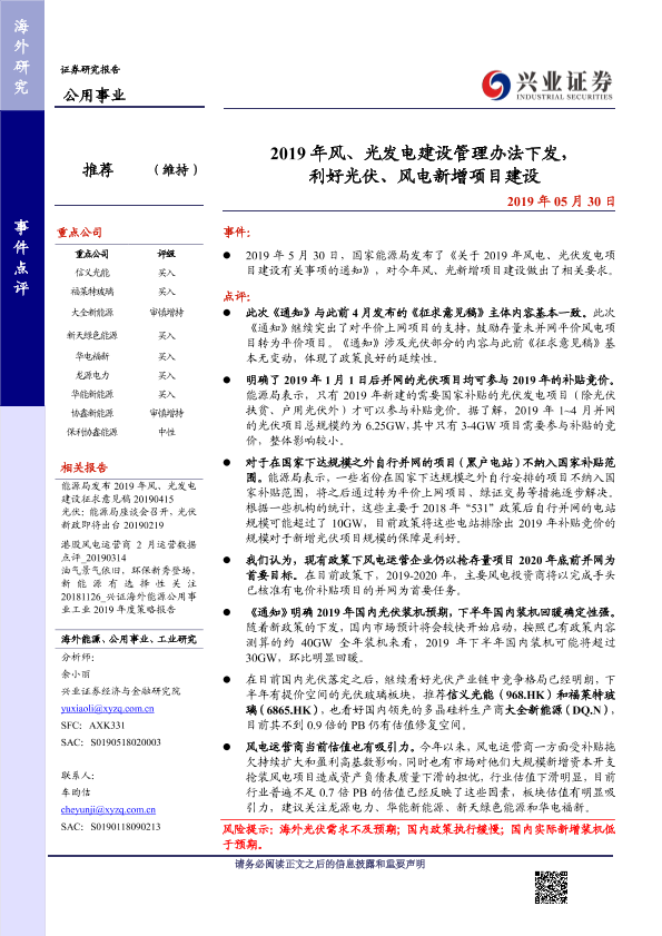 【兴业证券】【20190530】2019年风、光发电建设管理办法下发,利好光伏、风电新增项目建设-8页