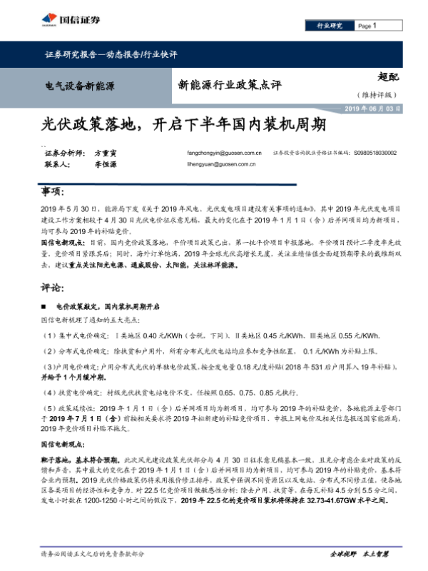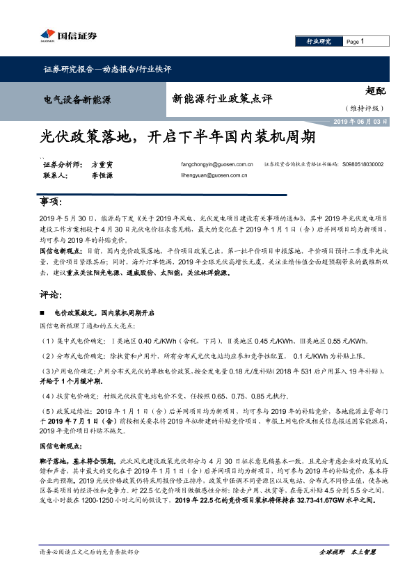 【国信证券】【20190603】20190603-国信证券-新能源行业政策点评:光伏政策落地,开启下半年国内装机周期-6页