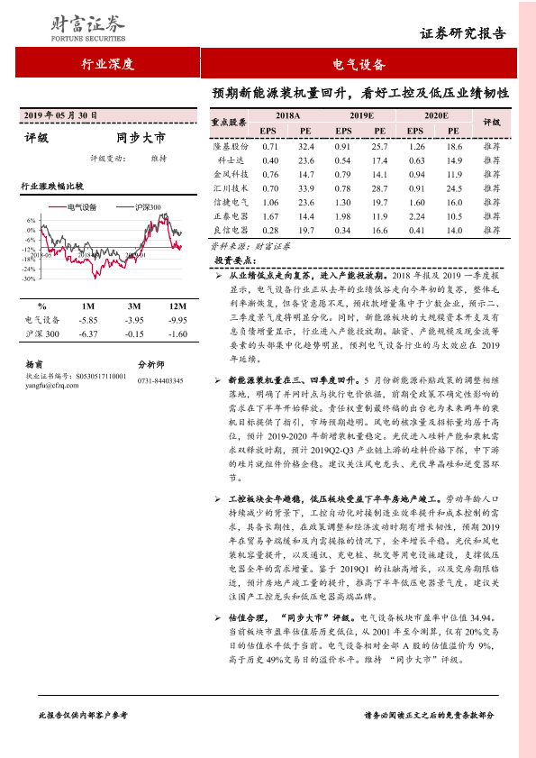 【财信证券】【20190530】电气设备行业深度:预期新能源装机量回升,看好工控及低压业绩韧性-42页