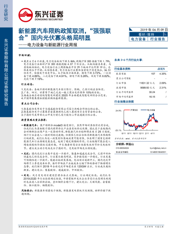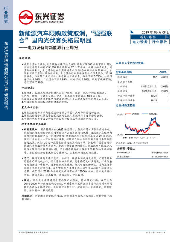 【东兴证券】【20190609】电力设备与新能源行业周报:新能源汽车限购政策取消,“强强联合”国内光伏寡头格局明显-13页