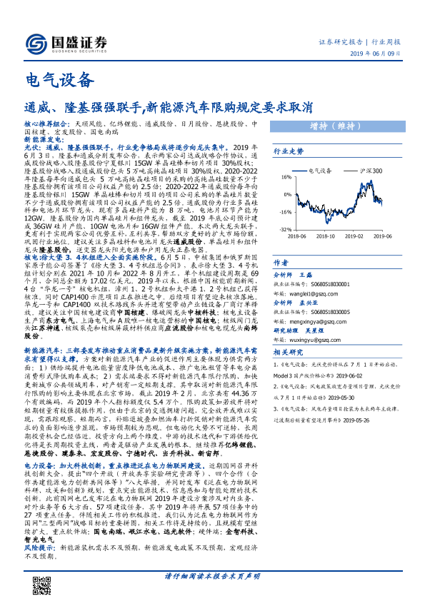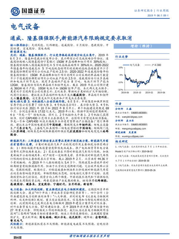 【国盛证券】【20190609】电气设备行业周报:通威、隆基强强联手,新能源汽车限购规定要求取消-18页
