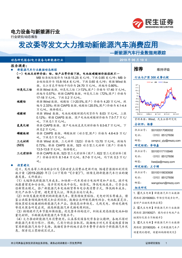 【民生证券】【20190610】新能源汽车行业数据周跟踪:发改委等发文大力推动新能源汽车消费应用-14页