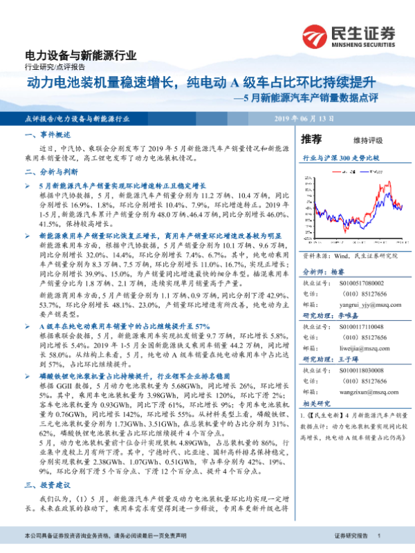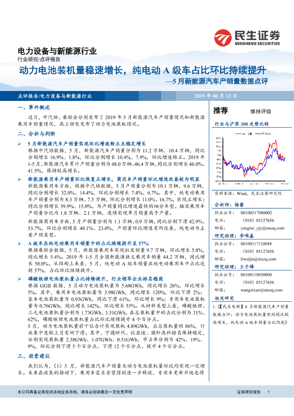 【民生证券】【20190613】5月新能源汽车产销量数据点评:动力电池装机量稳速增长,纯电动A级车占比环比持续提升-4页