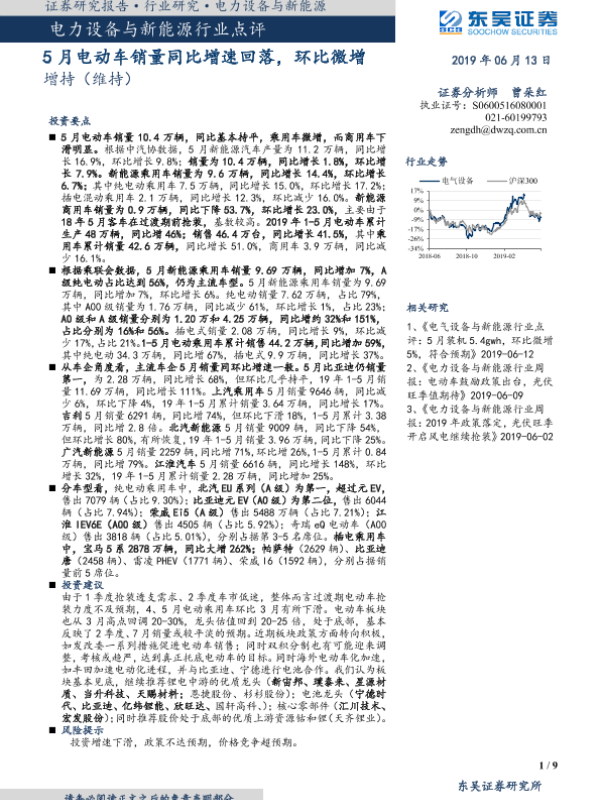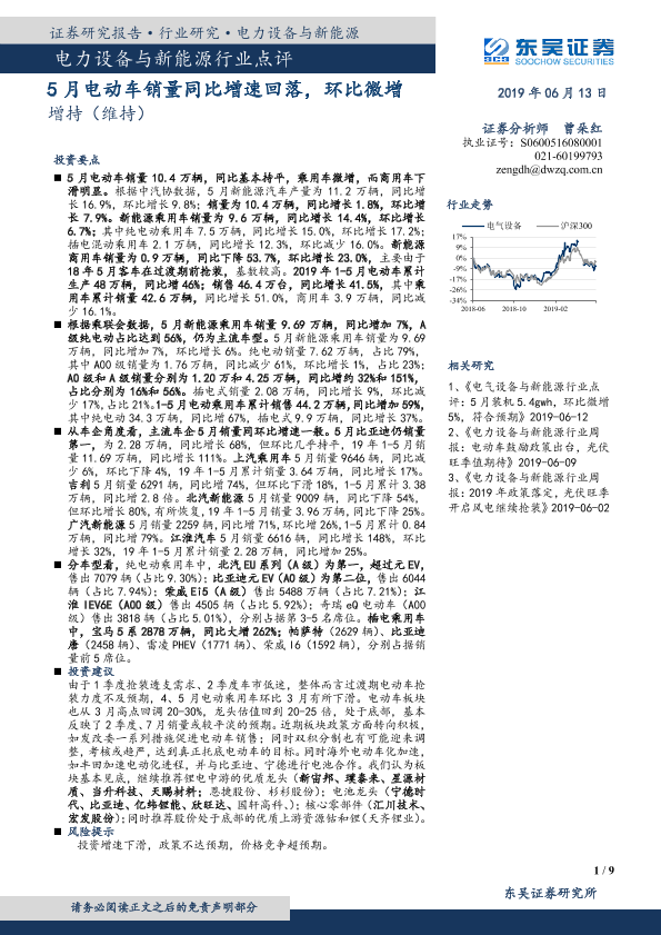 【东吴证券】【20190613】电力设备与新能源行业点评:5月电动车销量同比增速回落,环比微增-9页