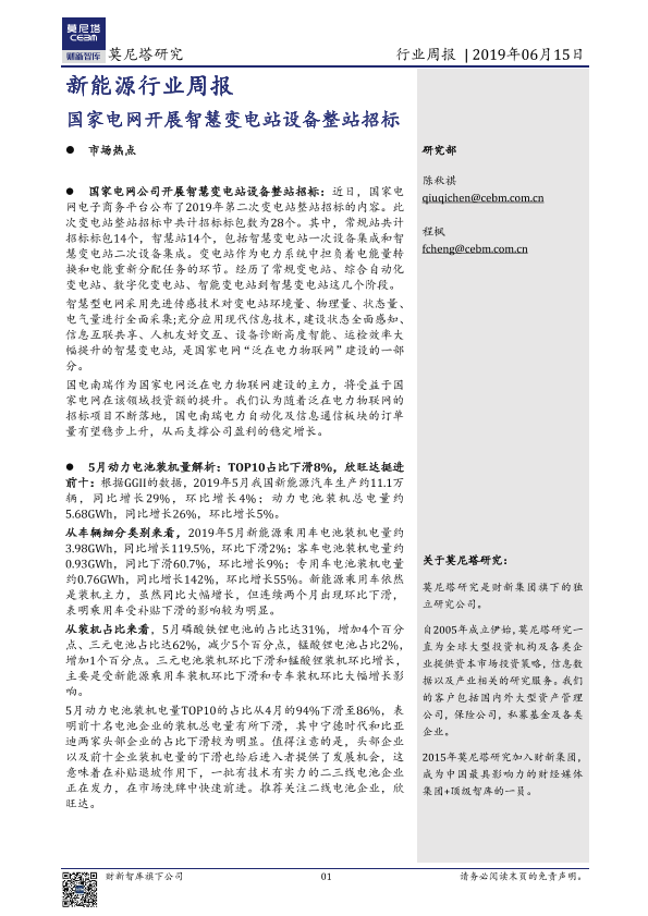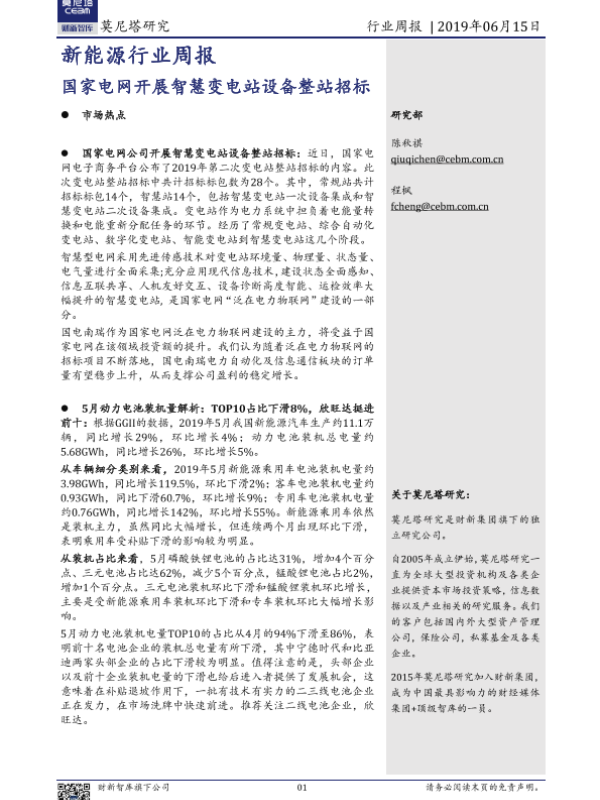 【莫尼塔研究】【20190615】20190615-莫尼塔投资-新能源行业周报:国家电网开展智慧变电站设备整站招标-10页