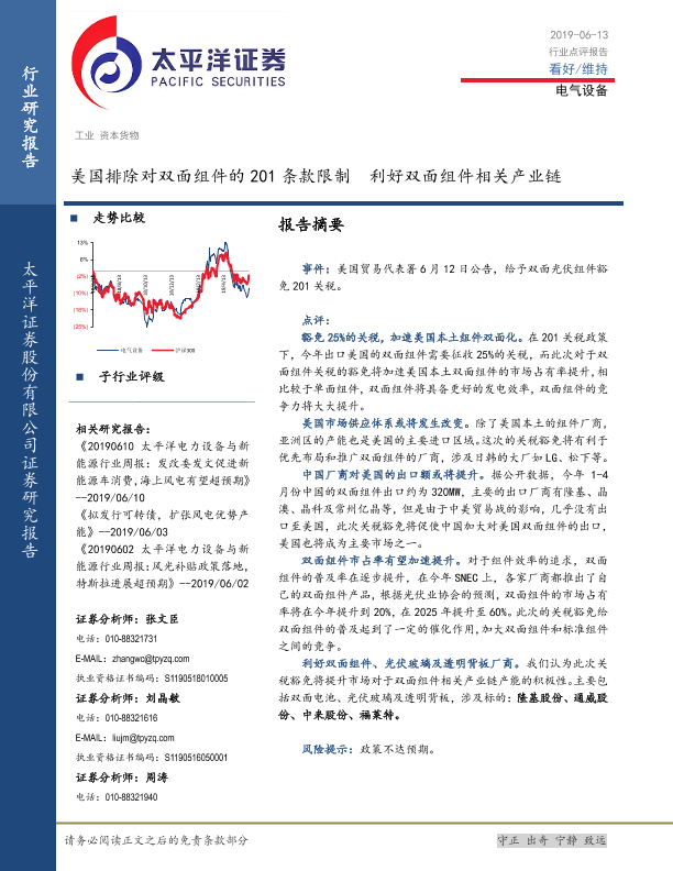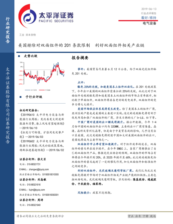 【太平洋证券】【20190613】美国排除对双面组件的201条款限制 利好双面组件相关产业链-5页
