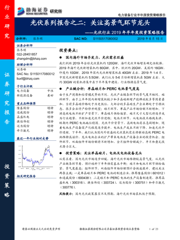 【渤海证券】【20190615】光伏行业2019年半年度投资策略报告:光伏系列报告之二:关注高景气环节龙头-23页
