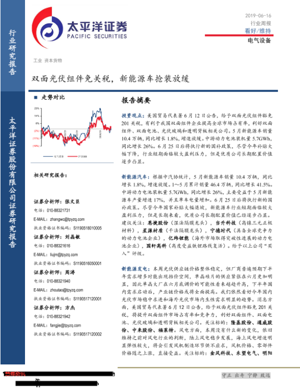 【太平洋证券】【20190616】电气设备行业周报:双面光伏组件免关税,新能源车抢装放缓-18页
