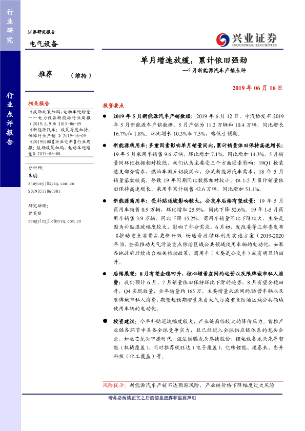 【兴业证券】【20190616】单月增速放缓,累计依旧强劲 -- 5月新能源汽车产销点评-5页