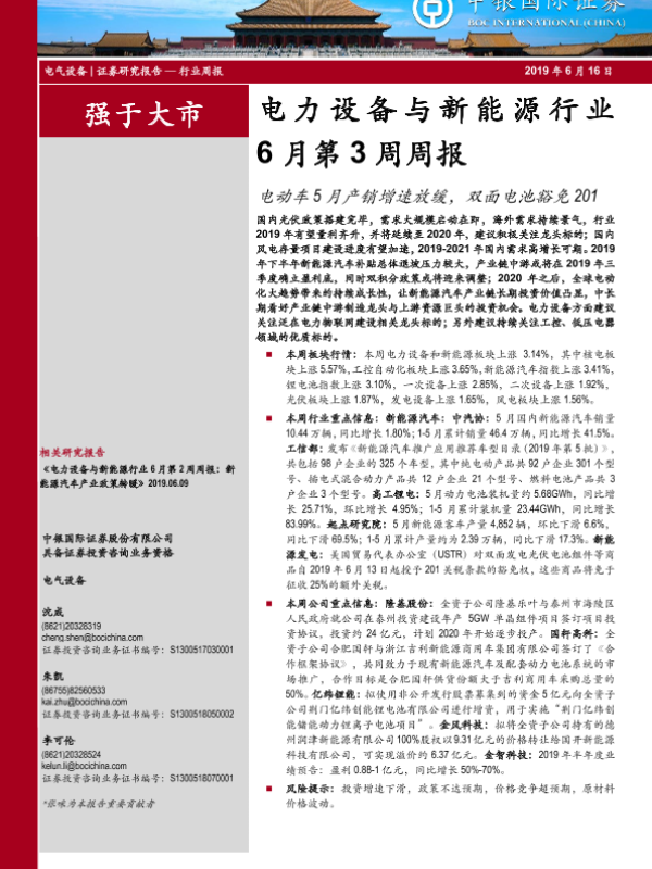 【中银证券】【20190616】电力设备与新能源行业6月第3周周报:电动车5月产销增速放缓,双面电池豁免201-19页