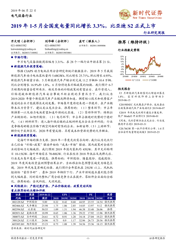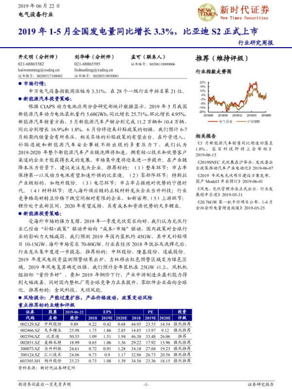 【新时代证券】【20190622】电气设备行业研究周报:2019年1-5月全国发电量同比增长3.3%,比亚迪S2正式上市-15页