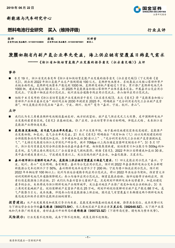 【国金证券】【20190622】《浙江省加快培育氢能产业发展的指导意见(征求意见稿)》点评-发展初期省内副产氢企业率先受益,海上供应链有望覆盖日韩氢气需求-3页