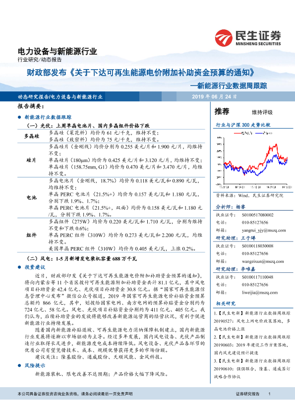 【民生证券】【20190624】财政部发布《关于下达可再生能源电价附加补助资金预算的通知》——新能源行业数据周跟踪-9页