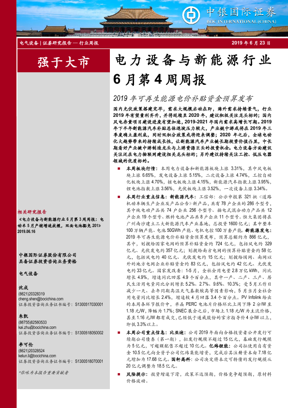 【中银证券】【20190623】电力设备与新能源行业6月第4周周报:2019年可再生能源电价补贴资金预算发布-17页