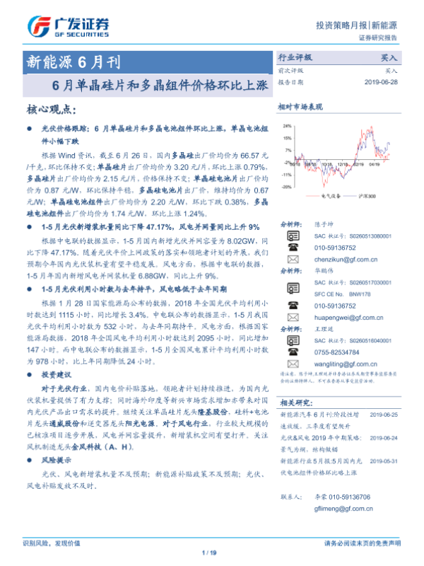 【广发证券】【20190628】20190628-广发证券-新能源6月刊:6月单晶硅片和多晶组件价格环比上涨-19页