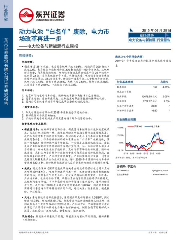 【东兴证券】【20190629】电力设备与新能源行业周报:动力电池“白名单”废除,电力市场改革再进一步-13页