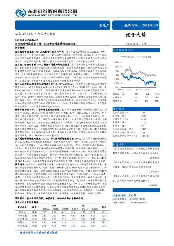 【东北证券】【20220121】1-12月房地产行业数据点评:当月投资增速再度下行,到位资金增速持续低位振荡-18页