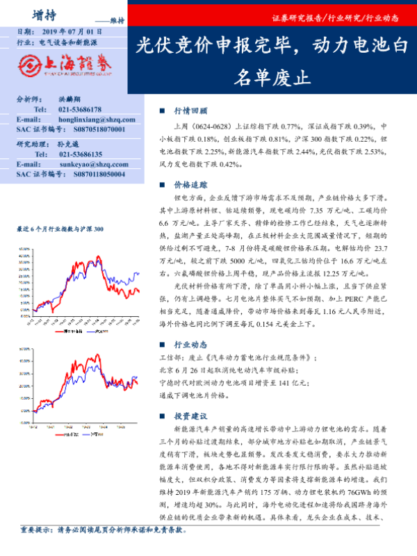 【上海证券】【20190701】电气设备和新能源行业动态:光伏竞价申报完毕,动力电池白名单废止-14页