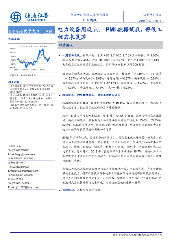 【海通证券】【20190707】电力设备周观点:PMI数据筑底,静候工控需求复苏-3页