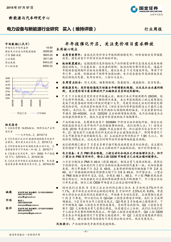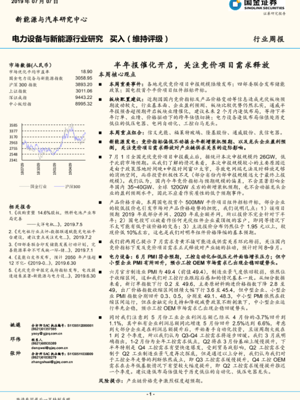 【国金证券】【20190707】20190707-国金证券-电力设备与新能源行业周报:半年报催化开启,关注竞价项目需求释放-4页